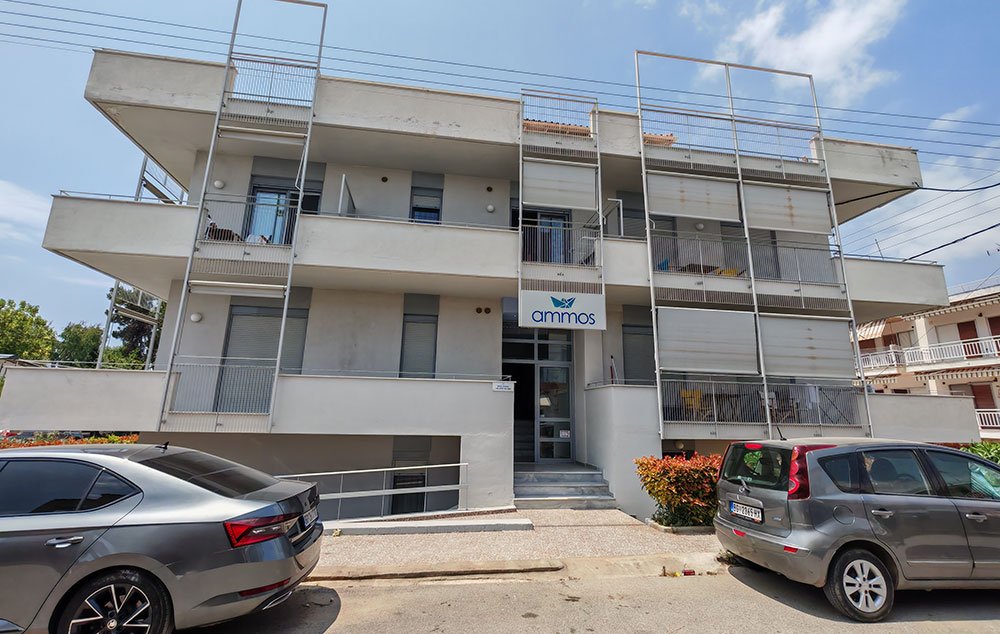 Kuća Amos se nalazi na oko 20m od mora odmah pored poznatog restorana Talasinos. Kuća se odlikuje izuzetno prostranim studijima, apartmanima i duplexima. Nalaze se u niskom prizemlju, prvom i drugom spratu. Kuća ima SAT TV, WIFI i klima uređaj čije je korišćenje uključeno u cenu. Svi imaju prostrane terase.