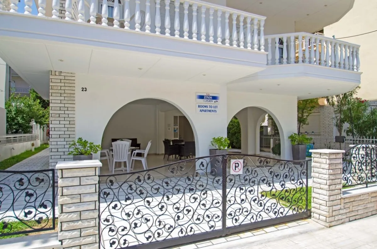 Vila se nalazi se na oko 80m od mora i oko 150m od centra Paralije. Zinos je jedna od najlepših vila u Paraliji, koja se nalazi u našoj dugogodišnjoj ponudi. Nalazi se u mirnom delu Paralije u drugoj ulici od mora, nedaleko od nešto šire plaže. U blizini vile je supermarket. Vila Zinos poseduje prostrane četvorokrevetne apartmane, koji se sastoje iz dve prostorije – spavaće sobe i dnevnog boravka u čijem sastavu je kompletno opremljena kuhinja, kupatilo i prostrane terase sa garniturom za sedenje. Sadržaj vile upotpunjuje besprekorno uređeno i ograđeno dvorište, sa česmom i tušem. U dvorištu se nalazi zajednička garnitura za sedenje, koju gosti koriste tokom boravka, a na dan smene za odlaganje stvari. Ispred ili nedaleko od vile je moguće parkirati automobil.