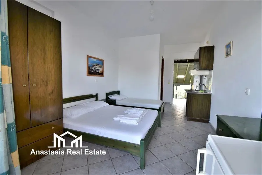 Vila Ikonomu Studios se nalazi u mirnom delu Pefkohorija, van vreve mesta i na samo 400m od najlepšeg dela plaža kao i šetališta. Centar mesta se na nalazi na istoj udaljenosti. U blizini vile se nalaze marketi, objekti brze hrane, pekare, kafei i ostalo. Vila nudi smeštaj u dvokrevetnim, trokrevetnim i četvorokrevetnim studijima koji su opremljeni čajnom kuhinjom (rešo sa dve grejne ploče) sa frižiderom, kupatilom sa tuš kadom, klima uređajem, LCD TV-om. Spratnost studija varira od prizemlja do drugog sprata. Iz jedinica na drugom spratu se pruža delimičan pogled na more. Vilu krasi prostrano dvorište sa roštiljem, velikim zajedničkim stolom za sedenje kao i ljuljaške za najmlađe goste. Popularna plaža Ksenija je udaljena samo 5,5km, dok su plaže Akrotiri i Elephant udaljene svega 5-6 minuta hoda. Ispred vile postoji i prostrani parking na kome ima mesta za najviše 12 vozila.