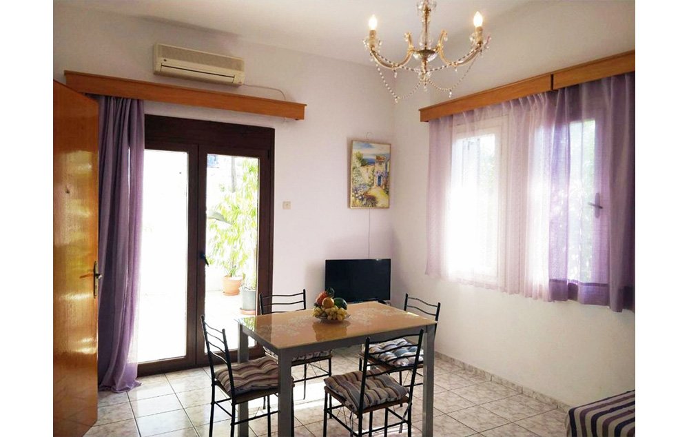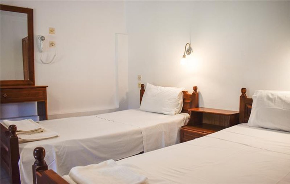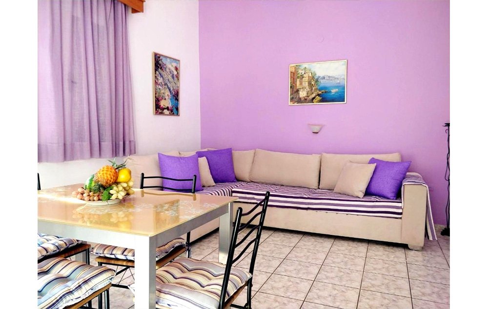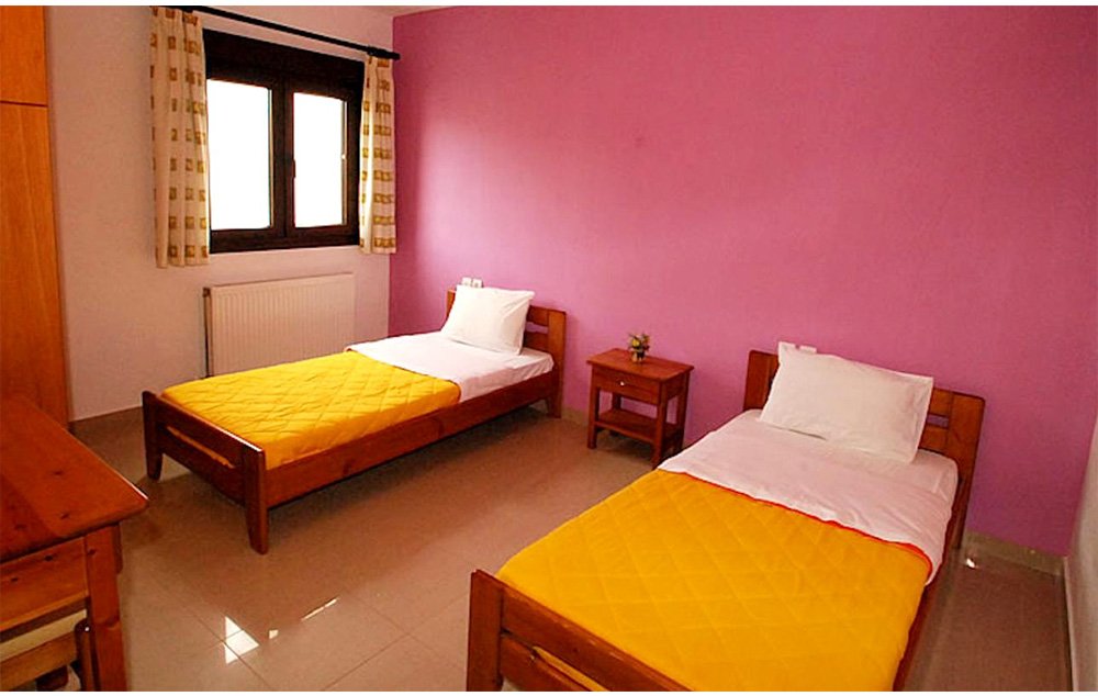 Vila Maria se nalazi u lepom mediteranskom vrtu, na idealnoj lokaciji, oko 800 metara od centra grada, na svega oko 170 metara od prelepe i jedne od najpoznatijih plaža na ostrvu, plaže Megali Amos (Velika plaža). Dvokrevetni i trokrevetni studiji vile Maria su smešteni na prvom spratu, a četvorokrevetni apartman na malo izdignutom prizemlju i svi su sa pogledom na dvorište. Opremljeni su klima uređajem (uključena u cenu), wi - fi Internetom i TV - om. Dvokrevetni i trokrevetni studiji sadrže opremljenu malu kuhinju sa delom za spavanje sa dva, odnosno tri standardna ležaja, kupatilo i lepu terasu sa garniturom za sedenje. Veličina studija je cca 18 – 20 kvm + terasa. Četvorokrevetni apartman se sastoji dnevnog boravka u kojem se nalazi dobro opremljena kuhinja (veliki frižider sa zamrzivačem, šporet sa rernom...) trpezarijski sto, ugaona sofa na kojoj može spavati dvoje dece do 12 godina, spavaće sobe sa francuskim ležajem, kupatila i velike terase sa garniturom za sedenje i pogledom na vrt. Veličina apartmana je cca 33 kvm + terase. Vila Maria je B kategorije, ima peškire i javni besplatni parking preko puta vile. Najbliži mini market je ispred vile, a autobuska stanica u neposrednoj blizini. Vila je idealna za mlade zbog blizine grada, ali i za porodice, jer je plaža u neposrednoj blizini, ima zidani roštilj i dvorište koje je na raspolaganju deci.