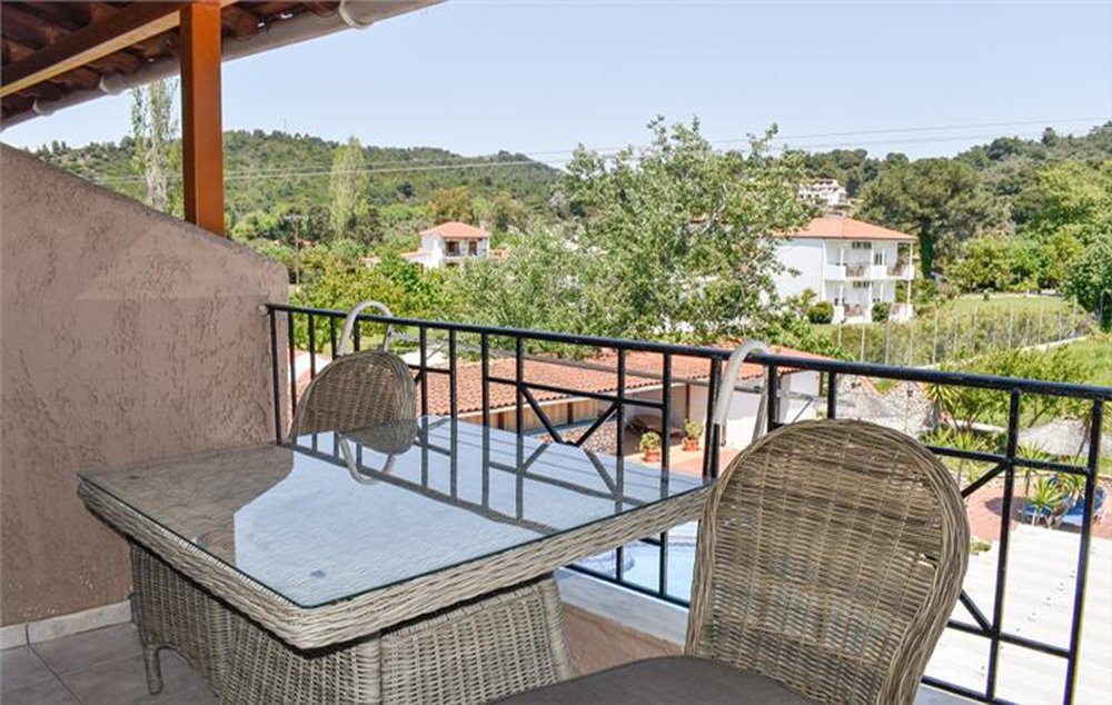 Vila Roula je novijeg datuma i nalazi u gradu Skiatosu, na oko 700 metara od strogog centra i oko 150 metara od najbliže autobuske stanice. Od najbliže plaže, Megali Amos, je nešto manje od oko 900 metara ili 2 autobuske stanice. Vila Roula je smeštena u lepom dvorištu sa zelenilom i cvećem. Dvokrevetni i trokrevetni studiji su na prizemlju, četvorokrevetni apartmani na prizemlju i prvom spratu, a prelepi četvorokrevetni+2 i petokrevetni+2 dupleks apartmani se nalaze na prvom spratu. Studiji sadrže opremljenu kuhinju, deo za spavanje s francuskim, odnosno tri standardna ležaja, kupatilo i lepe velike terase sa garniturom za sedenje u prirodnoj hladovini i zelenilu. Veličina studija je cca 20 - 23 kvm + terasa. Četvorokrevetni apartman se sastoji od sobe u kojoj je kuhinja i dva standardna ležaja, spavaće sobe sa dva standardna ležaja, kupatila i terase s garniturom za sedenje, odnosno dela dvorišta s garniturom za sedenje. Veličina apartmana je cca 30 kvm + terasa. Četvorokrevetni+2 i petokrevetni+2 dupleks apartmani se sastoje od dnevnog boravka s kuhinjom i trpezarijom u kojoj je klima uređaj i TV, dve spavaće sobe sa po francuskim i dva standardna ležaja, kupatila i lepe, velike terase s garniturom za sedenje. Petokrevetni dupleks u dnevnoj sobi ima dodatni standardni ležaj i sofu na otvaranje na kojoj može da spava dvoje dece do 12 godina, (što ima i četvorokrevetni+2). Veličina apartmana je cca 45 kvm + terasa. Svi studiji i apartmani su opremljeni TV – om, wi – fi Internetom i klima uređajem (uz doplatu na licu mesta (opcija), 8 eura dnevno po studiju/apartmanu). Vila Roula je B + kategorije, ima peškire i ima mogućnost sopstvenog parkinga. Najbliži mini market je udaljen oko 120 metara.